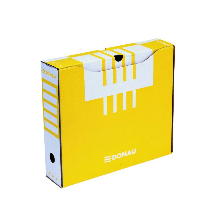 Archívny box z trojvrstvovej lepenky s certifikátom FSC® (drevo na jej výrobu pochádza z lesov, obhospodarovaných udržateľným spôsobom), bez obsahu kyseliny (pH 7,5). Vhodný na archiváciu dokumentov do formátu A4 s otvorom na ľahkú manipuláciu. Možnosť archivovať aj zakladač Donau. Predtlače na popis na dlhšej i kratšej strane umožňuje skladovanie vo vodorovnej aj zvislej polohe. Box je využiteľný samostatne alebo v kombinácii s archivačnými krabicami. Gramáž 390 g. Rozmery 297x80x339mm. Väčšie balenie 20 ks.