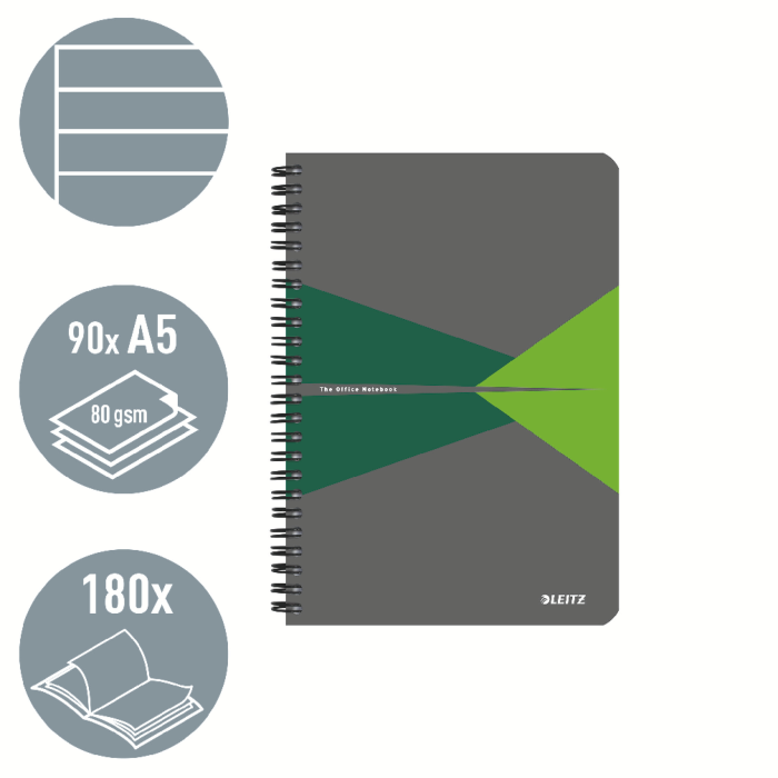 Špičkový zápisník na každodenné používanie. Každý zápisník má 90 listov papiera najvyššej kvality s gramážou 80 g/m2, drôtená väzba umožňuje 360-stupňové otváranie, laminované kartónové dosky.