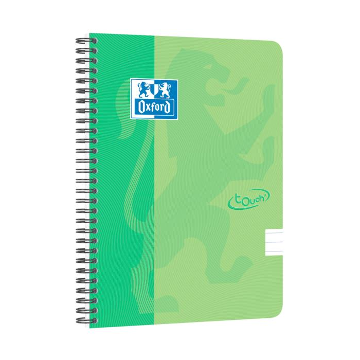 Blok špirálový Oxford Nordic Touch A5+/70 listov linajkový, zelený, na dvojitej čiernej špirále, dosky z tvrdého kartónu so soft touch povrchom, kompatibilný so SCRIBZEE, biely, dokonale hladký papier Optik Paper+, neprepíja, certifikácia EÚ ecolabel.
