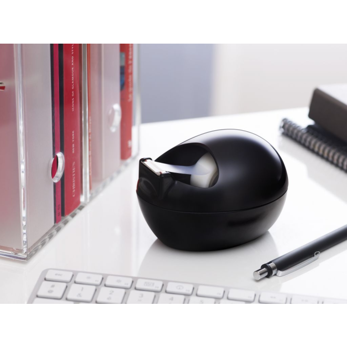 Stolový dispenzor v modernom dizajne od Karima Rashida s vysoko kvalitným nožom na odrezanie pásky a neviditeľnou páskou z prírodných vlákien Scotch® Magic™ 900 rozmerov 19 mm × 33 m. Farba čierna.