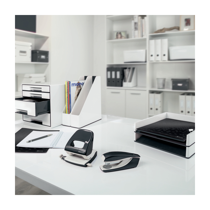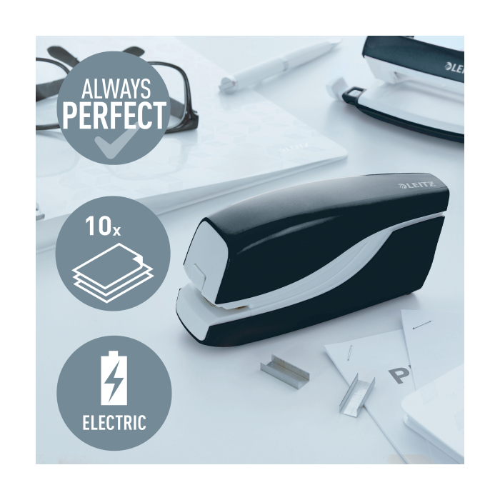 Elektrická zošívačka Leitz New NeXXt WOW. Vďaka jednoduchému ovládaniu jednou rukou je ideálna na časté používanie.