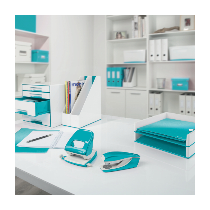 Elektrická zošívačka Leitz New NeXXt WOW. Vďaka jednoduchému ovládaniu jednou rukou je ideálna na časté používanie. Technológia s napájaním na batérie na zošívanie v pohybe. V žiarivých farbách WOW. Batérie (4× 1,5 V AAA LR03) nie sú súčasťou balenia. Kapacita 10 listov. Náhradné spinky ES556800. Farba ľadovo modrá.