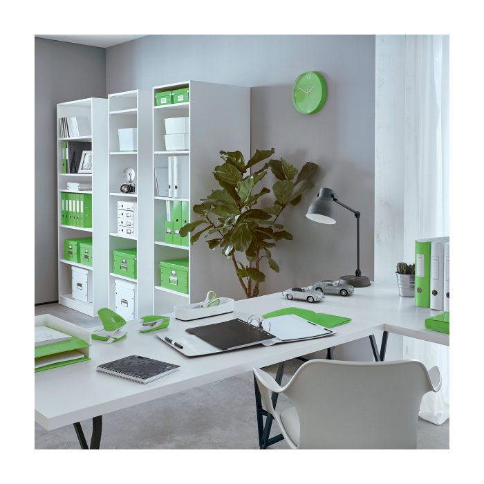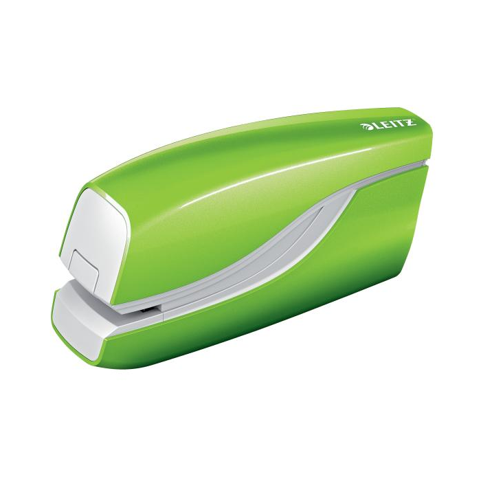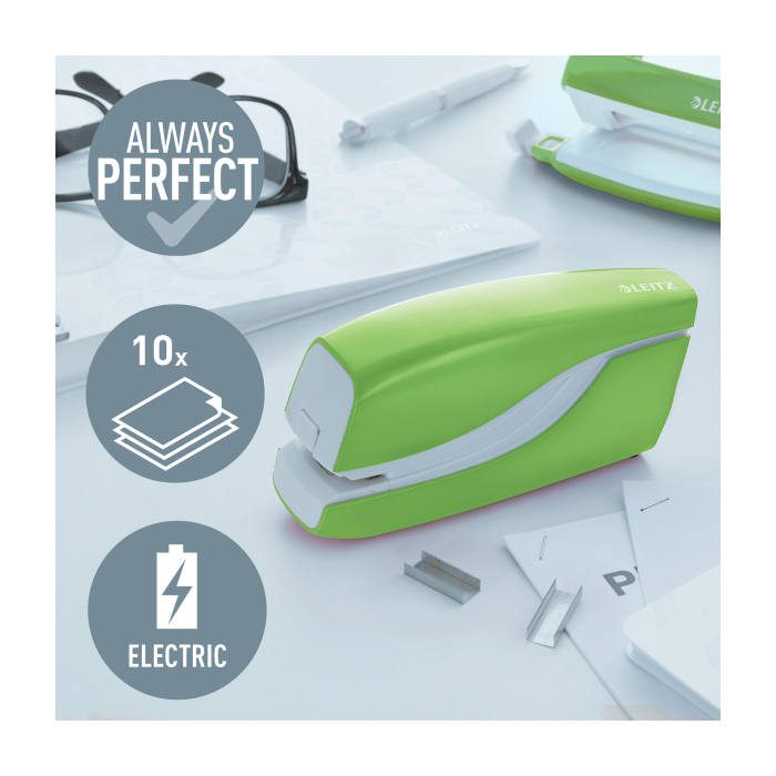 Elektrická zošívačka Leitz New NeXXt WOW. Vďaka jednoduchému ovládaniu jednou rukou je ideálna na časté používanie. Technológia s napájaním na batérie na zošívanie v pohybe. V žiarivých farbách WOW. Batérie (4× 1,5 V AAA LR03) nie sú súčasťou balenia. Kapacita 10 listov. Náhradné spinky ES556800. Farba zelená.
