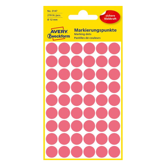 Kruhové etikety na ručný popis. Priemer 12 mm, v balení 270 etikiet. Farba neónová červená.