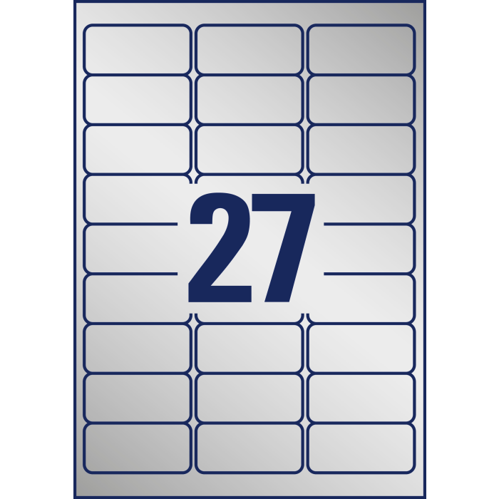 Veľmi odolné polyesterové etikety odolné voči oleju, prachu, špine, natrhnutiu, vode. Odolávajú teplotám od −40 ° do + 150 °C. Určené pre tlač v laserových tlačiarňach. Vhodné aj pre vonkajšie použitie. Rozmery v mm : 63,5 × 29,6. Farba strieborná. Etikety na hárku 27 kusov. Balenie 20 hárkov.