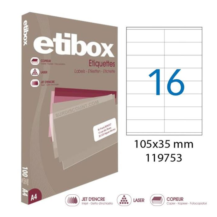 Cenovo výhodné etikety vhodné do laserových a atramentových tlačiarní, ako aj kopírovacích strojov. Rozmery: 105x35 mm Počet etikiet: 1600 Balenie: 100 hárkov
