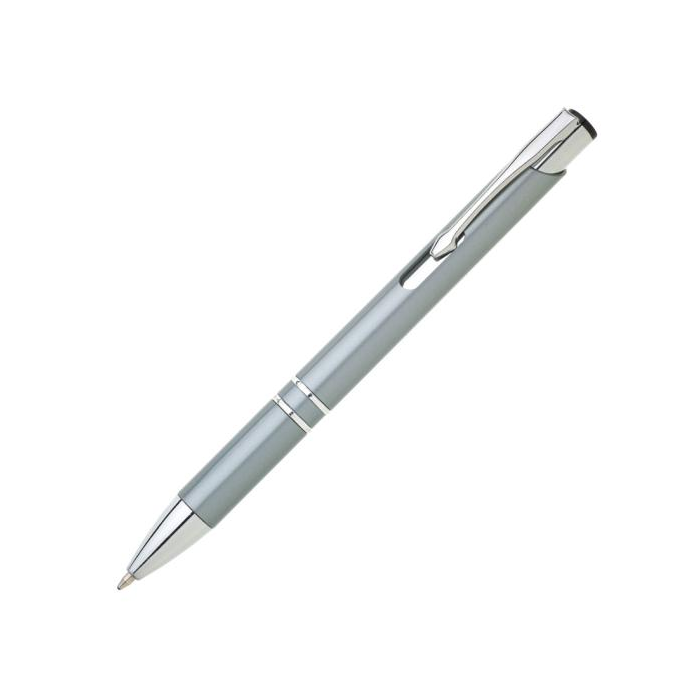 Plastové guľôčkové pero OIRA s kovovými doplnkami. Modrá náplň veľkoobjemová. Farba sivá.