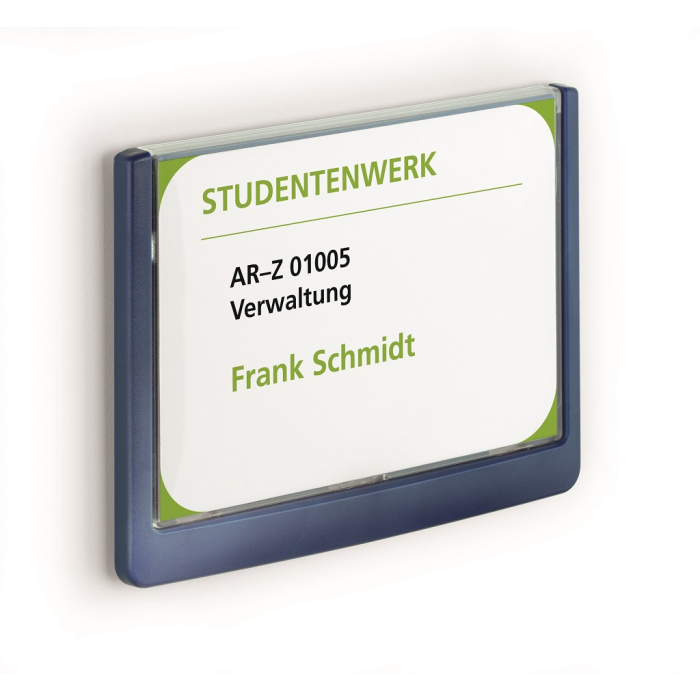 Moderná informačná tabuľka na dvere s lemom v atraktívnej modrej farbe. Predný panel sa otvára na jedno zatlačenie, a tým sa jednoducho sprístupnia vložené popisné papiere, ktoré sa môžu vymieňať podľa potrieb. Tabuľka je ideálna do kancelárií, úradov, škôl, univerzít a hotelov. Súčasťou balenia je montážna sada s názorným návodom. Namiesto pevného montovania môže byť tabuľka k povrchu aj prilepená.