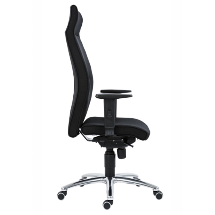 Kancelárske kreslo s opierkou hlavy, výškovo nastaviteľnými podrúčkami a dopredným náklonom sedáku pre zlepšenie krvného obehu.