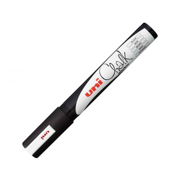 Kriedové popisovače s možnosťou použitia pre priemysel, dekoráciu, informačné tabule a hobby. Na čistých a odmastených neporéznych povrchoch text po zaschnutí odoláva vode a UV, ale je stierateľný vlhkou handričkou. Vhodné na okná, zrkadlá, kovové a plastové povrchy. Hrot guľatý, šírka stopy 1,8 - 2,5 mm. Farba čierna.