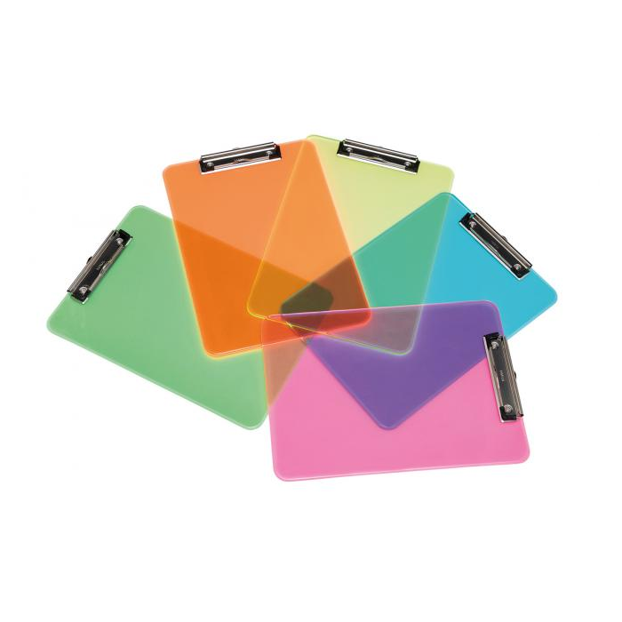 Písacia podložka A4 z priehľadného plastu v piatich neónových farbách s možnosťou zavesenia. Ľahko uchopiteľný silný plochý kovový klip s ochrannými plastovými rohmi. Rozmery 22,6 × 31,8 × 1,5 cm, hrúbka podložky cca 0,24 cm, kapacita klipu cca 0,8 cm, hmotnosť 0,198 kg. Podložka je recyklovateľná. Farba transparentná ružová.