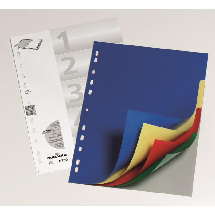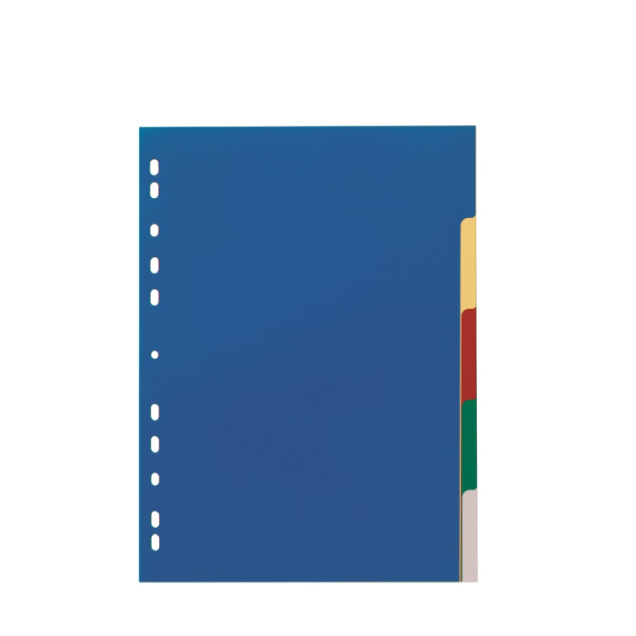 Farebný rozraďovač z polypropylénu s 5 oddielmi bez popisu. Formát A4, eurodierovanie, popisovateľný papierový titulný list na ľahkú orientáciu v dokumentoch. Balenie jedna sada v polyesterovom sáčku. Väčšie balenie 25 sád. Farba: 5 farieb Formát: A4