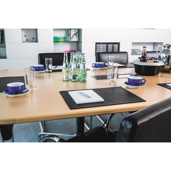 Podložka na stôl vysokej kvality vyrobená z najjemnejšej zrnitej kože. Ručná výroba, prešívaný lem, zadná strana z vysokokvalitného fleesu. Rozmery 42 × 30 cm. Farba čierna.