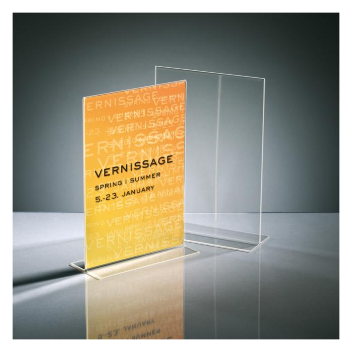 Univerzálny stojan odolný voči UV žiareniu v kolmej verzii. Vhodný na výstavy, veľtrhy, ponukové listy, jedálne lístky a propagačné materiály. Vyrobený z kvalitného číreho akrylu, stabilný a pevný. Formát A4.
