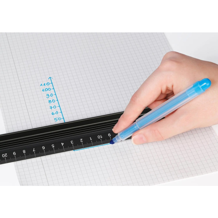 Vysokokvalitné rezacie pravítko z čierneho eloxovaného hliníka pre dlhú životnosť. Ľahko čitateľné centimetre pre maximálnu presnosť pri rezaní. 4 mm vysoká rezná hrana zaisťuje presné rezanie. Vysoký chránič proti prerezaniu (12,5 mm), ktorý účinne zabraňuje poraneniu prstov. Vyvýšený hrebeň zabraňuje rozmazaniu atramentu. Žiadne skĺznutie pri kreslení alebo strihaní vďaka 15 mm širokému protišmykovému pásiku na spodnej strane. Dĺžka 45 cm.