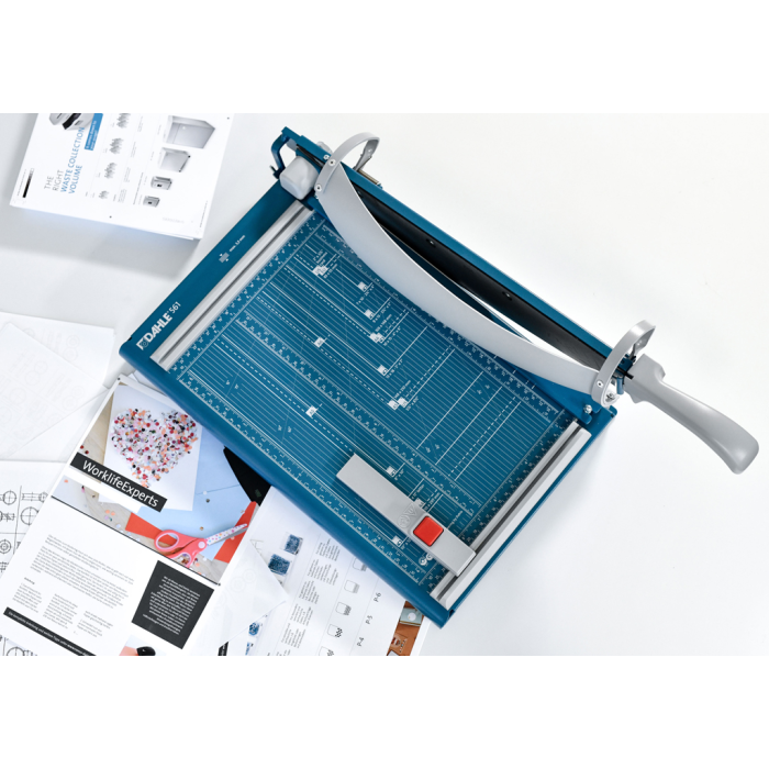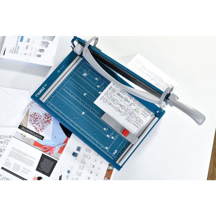Páková rezačka z pevného oceľového plechu. Základný vrchný a základný spodný brúsený nôž vyrobený z kvalitnej nožiarskej ocele Solingen. Rotujúci kryt okolo ostria chráni prsty pred náhodným porezaním. Presná mierka v cm/inch a DIN formátoch. Automatický prítlak. Model s výrezmi na pohodlné prenášanie.