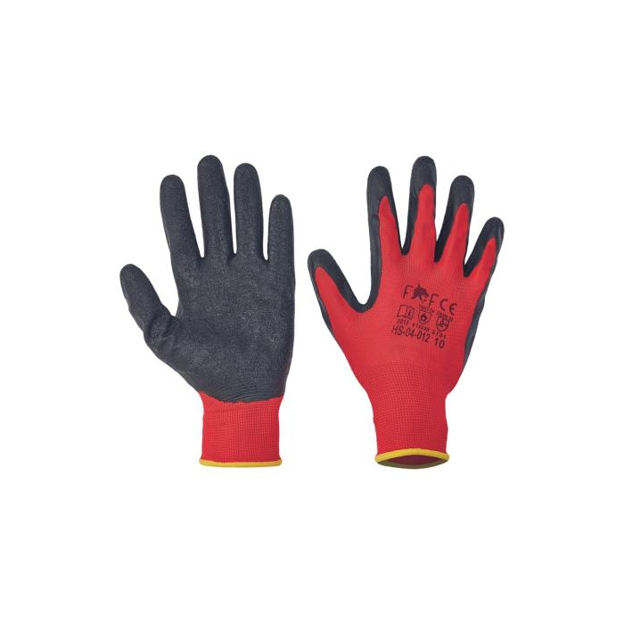 Pletené bezšvové polyesterové rukavice, máčané v čiernom latexe na dlani a na prstoch, pružná manžeta.