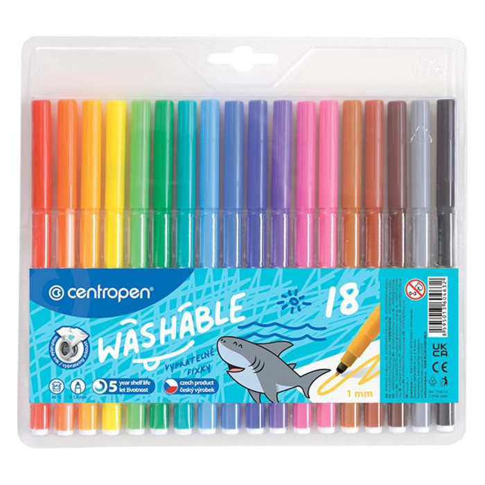 Popisovač vyrobený z PP s ventilačným bezpečnostným uzáverom a vláknovým hrotom odolným voči zatlačeniu. Šírka stopy 1,8 mm. Dodávaný v sade 18 farieb.