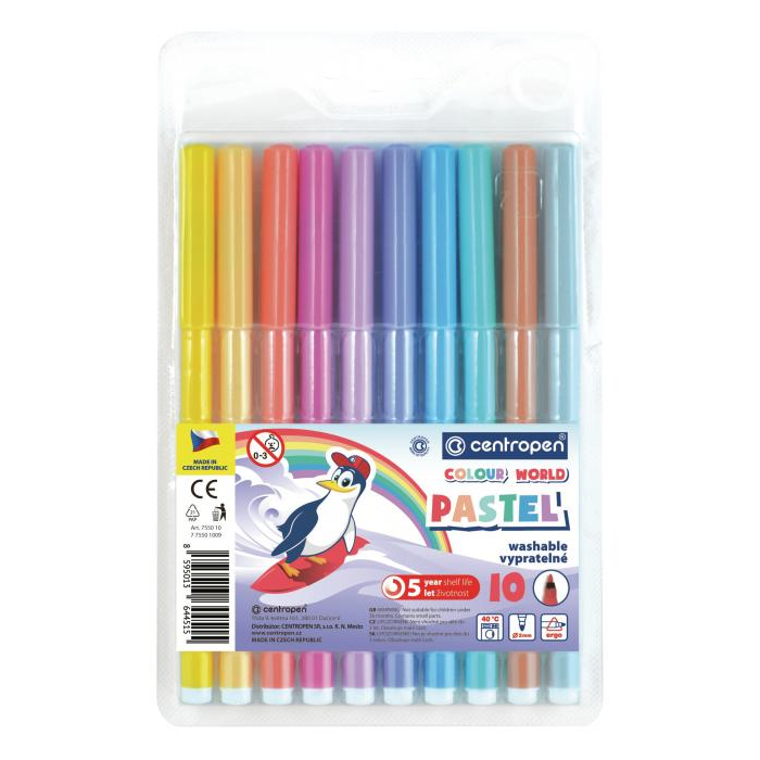 Vyprateľné farebné pastelové popisovače s ERGO držaním odolávajú vyschnutiu až 5 rokov. Zdraviu neškodlivý atrament, ventilačný vrchnák valcový hrot odolný voči zatlačeniu, šírka stopy 1 mm. Sada 10 popisovačov.
