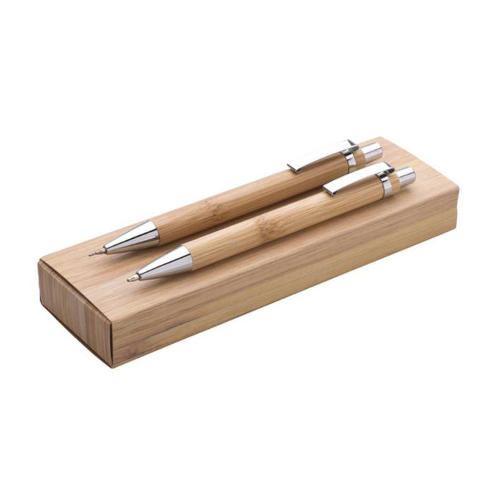 Guľôčkové pero a mikrotužka majú bambusové telo. Krabička je papierová s motívom bambusového dreva.