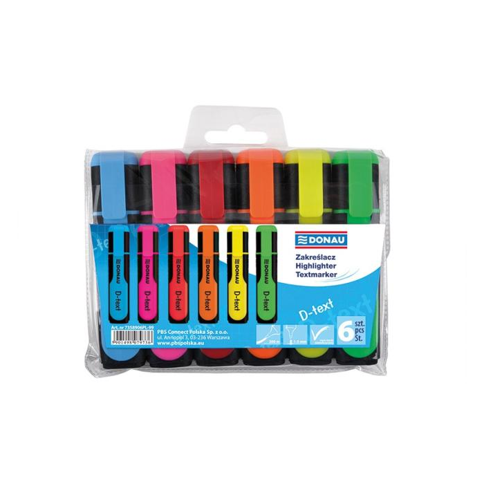 Sada 6 zvýrazňovačov so zrezaným hrotom na vyznačovanie textu. Šírka stopy 1-5 mm, dĺžka stopy 200 m.