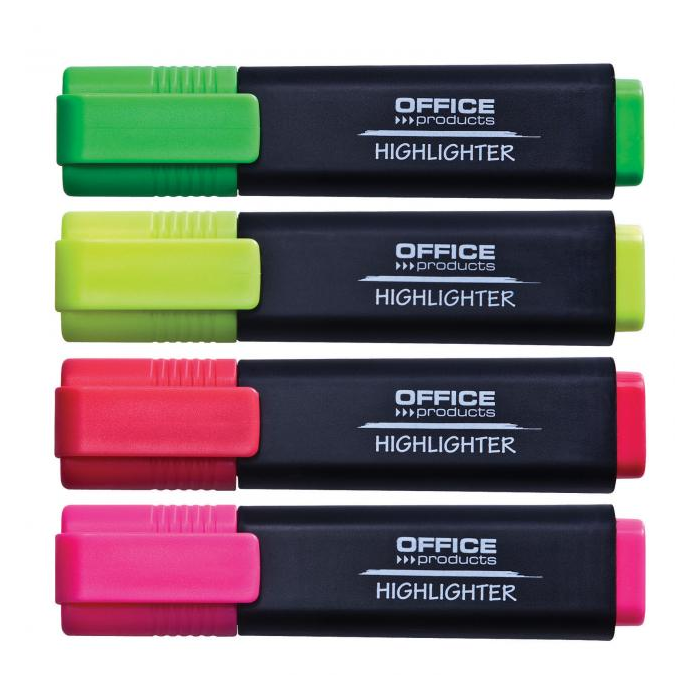Zvýrazňovače na zvýraznenie textu na liste papiera, v knihe, na fotokópiách a atramentových a laserových výtlačkoch. Klip, zrezaný hrot, šírka stopy 1 - 5 mm, dĺžka 250 m. Sada 4 farieb.
