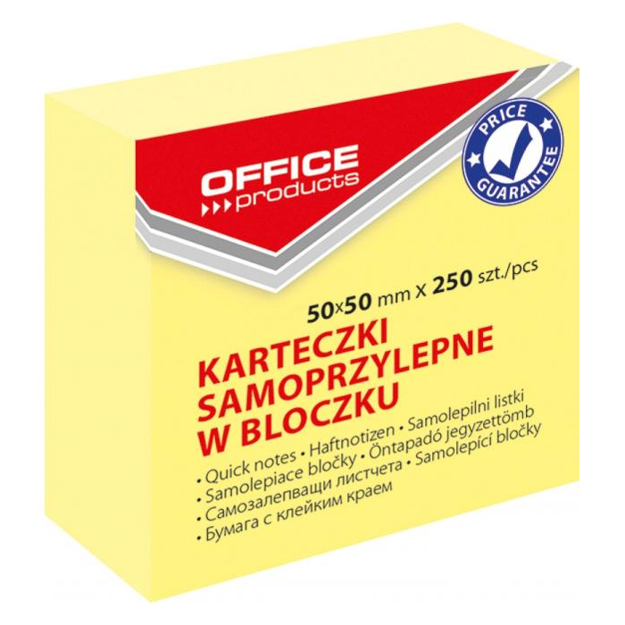 Lepiace bločky na poznámky, ideálne na zanechanie správ v kancelárii alebo doma. Počet lístkov: 250 vo veľkosti 50x50mm. Každá kocka je jednotlivo zabalená do fólie. Farba: pastelovo žltá.