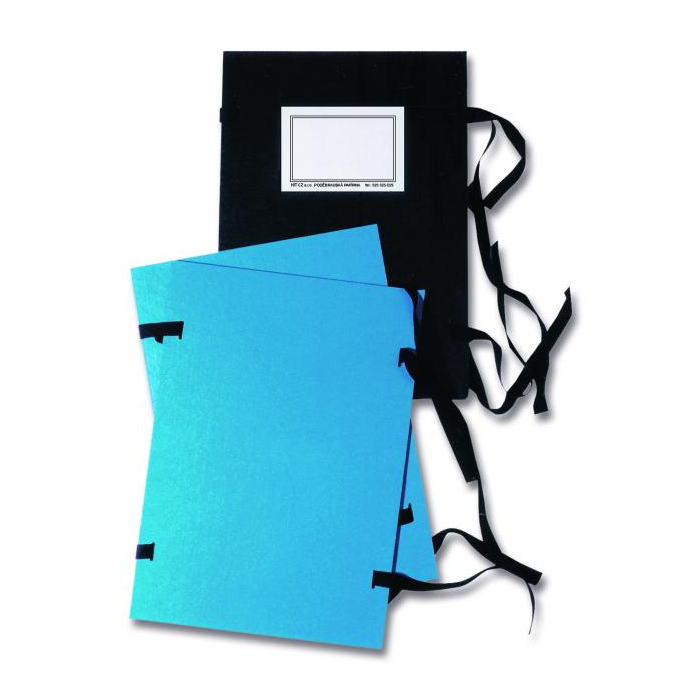 Spisové dosky so šnúrkami a nalepenou etiketou z jednostranne lakovanej lepenky hrúbky 1,5 mm. Formát A4. Väčšie balenie 25 ks. Farba čierna.