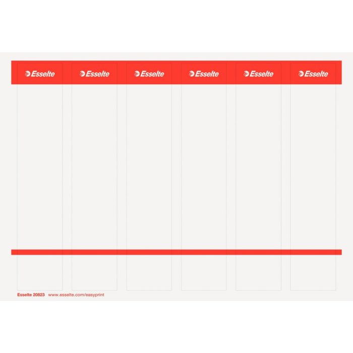 Náhradné samolepiace papierové chrbtové štítky na šírku chrbta 5 cm na identifikáciu založených dokumentov. Štítky sú vhodné na potlač do laserových a atramentových tlačiarní a kopíriek cez jednoduchý internetový nástroj `EASYPRINT` na stránke www.esselte.com/easyprint. V balení 10 hárkov (á 6 štítkov/hárok) s predperforovanými štítkami. Farba biela.