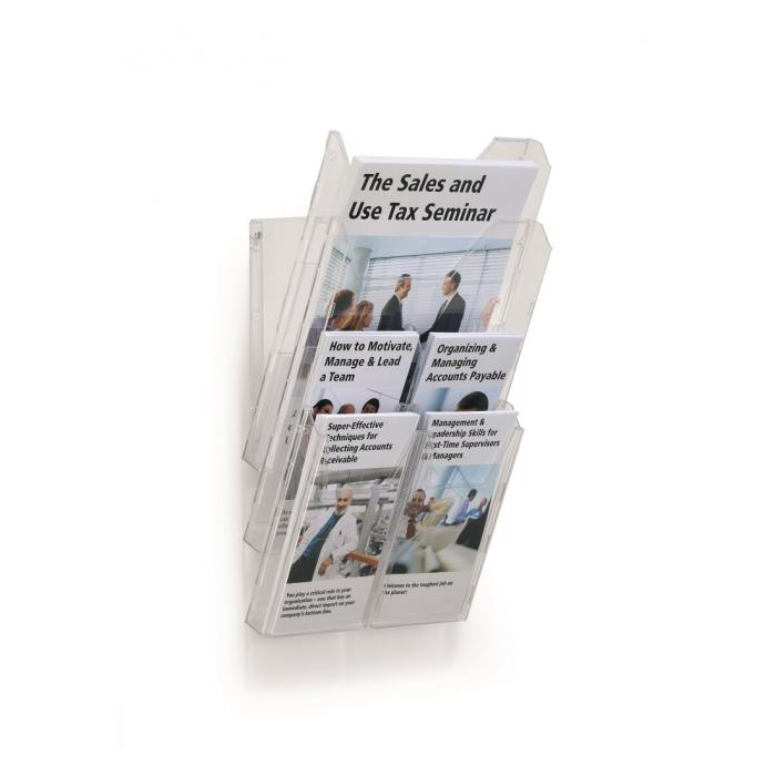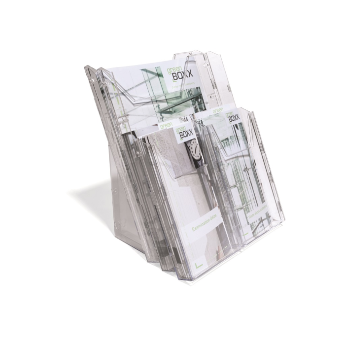 Kombinovaný stojan COMBIBOXX A4 s odkladačom A4 vnútorných rozmerov 240 × 311 mm a štyroch odkladačov 1/ 3 A4 (DL alebo A6) s hĺbkou 24 mm. Možnosť aplikácie na stenu alebo stôl. Materiál priehľadný plast.