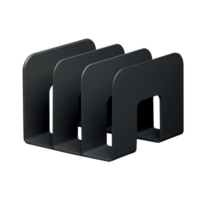 Trojpriehradkový stojan na katalógy pre flexibilné použitie. Vyrobený z recyklovaných plastov v kvalite Blue Angel. Priehradky široké 65 mm. Jednoduché zasúvanie a vyberanie. Vhodný pre časopisy, brožúry, katalógy atď. Rozmery: 215 x 165 x 210 mm (Š x V x H). Farba čierna.