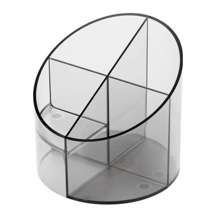 Stojan so štyrmi oddielmi na perá, ceruzky a kancelárske drobnosti z plastu v ekonomickom prevedení. Výška 105 mm, priemer 110 mm. Farba priehľadná dymová.