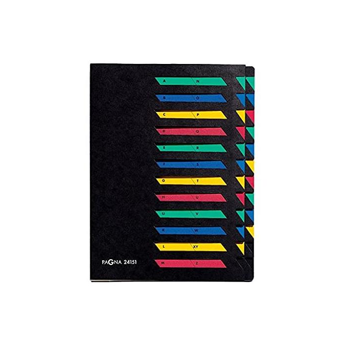 24-dielna stolová triediaca kniha Pagna z pevného hladeného kartónu gramáže 450 g na číselné alebo abecedné triedenie. Farba vrchného obalu čierna. Otvory na titulnej strane na popis jednotlivých oddielov, jednotlivé oddiely farebne rozlíšené, rýchle otvorenie príslušného oddielu vďaka bočnému výseku, rozťahovateľný chrbát s veľkou kapacitou jednotlivých oddielov.