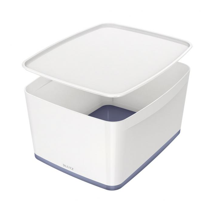 Výnimočne pevný box s vekom z modulárneho systému Leitz MyBox® z kvalitného materiálu. Dvojfarebné prevedenie a lesklý povrch vytvárajú unikátny dojem. Je určený na rýchle uskladnenie dokumentov a ďalších predmetov. Odolný voči poškriabaniu a vodotesný, s guľatými rohmi pre jednoduché čistenie. Nenápadný okraj drží veko v zavretej pozícii a pritom sa ľahko otvára. Pri nepoužívaní je možné viaceré boxy stohovať na seba a šetriť tak miesto. Box dobre dopĺňa ostatné produkty najmä dvojfarebného radu WOW.Rozmery 318 × 385 × 198 mm. Objem 18 litrov.