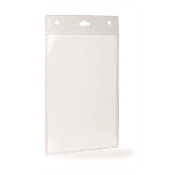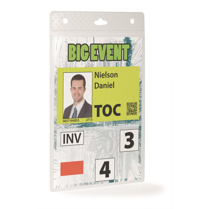 Visačka z PP s perforáciou na uchytenie. Ideálna na vybavenie väčšieho počtu osôb na konferenciách, výstavách a pod. Dodávaná spolu s etiketou formátu A6. Použiteľná s textilným remienkom, výsuvným kotúčom alebo retiazkou. Balenie 20 kusov. Vnútorný rozmer: š105xv148mm