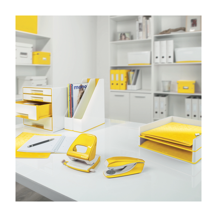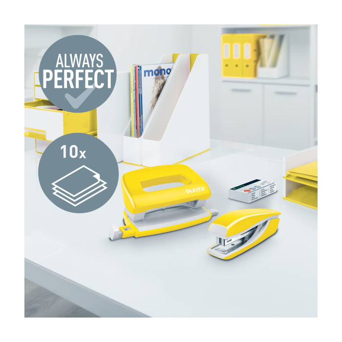 Malá zošívačka v moderných žiarivých farbách ideálna nielen do kancelárie, ale aj domov alebo na cesty. Vždy perfektné zošitie vďaka patentovanej technológii DIT. V kombinácii so spinkamii Leitz Power Performance P2 (č. 10) dosiahnete vždy jednoduché a správne zošitie.Kapacita 10 hárkov. Vrecková zošívačka. Patentovaná technológia DIT na spoľahlivé zošívanie. Balenie v škatuľke, vrátane spiniek. Otvorením ramena o 180° je možné použiť nástenkové zošívanie (takrovanie). Farba žltá.