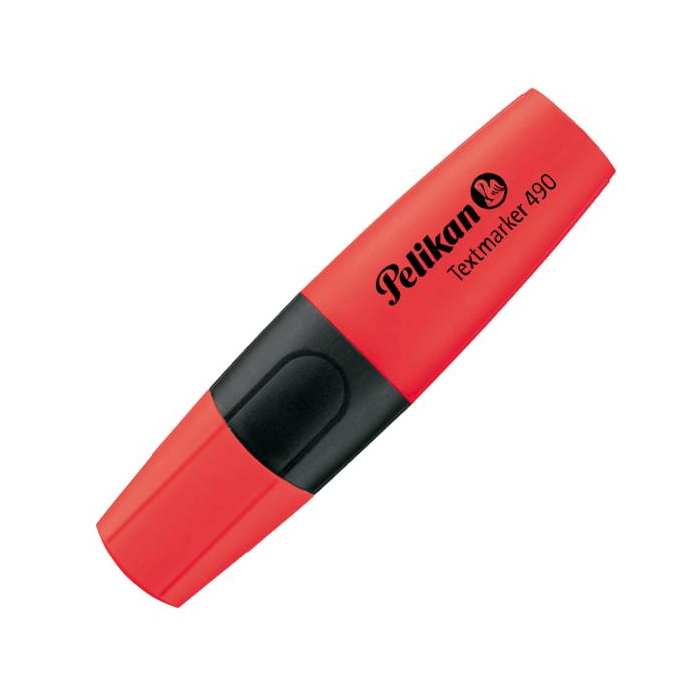 Zvýrazňovač Pelikan 490 osadený klinovým hrotom so šírkou stopy 1 - 5 mm. Plnený atramentom na vodnej báze, vhodným na všetky druhy papierov, odolný voči vysychaniu. Balenie v krabičke. Farba červená.